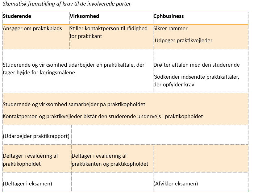 Praktikvirksomheden stiller en kontaktperson til rådighed for den studerende i praktikperioden. Kontaktpersonen udformer i samarbejde med den studerende en praktikaftale, hvoraf det fremgår, hvilke opgaver, den studerende skal arbejde med i praktikperioden. Opgaverne skal tilgodese læringsmålene for praktikken.