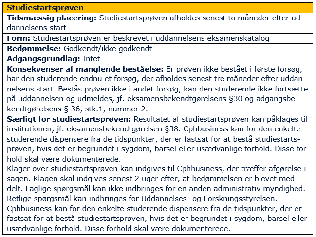 Cphbusiness afvikler studiestartsprøver på alle uddannelser. En studerende skal bestå studiestartsprøven for at kunne fortsætte på uddannelsen, jf. eksamensbekendtgørelsen § 30.