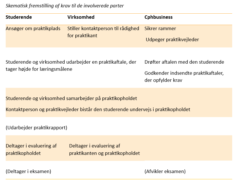 Praktikken skal i samspil med uddannelsens teoretiske dele styrke den studerendes læring og bidrage til opfyldelsen af uddannelsens mål for læringsudbytte. I praktikken arbejder den studerende med fagligt relevante problemstillinger og opnår kendskab til relevante erhvervsfunktioner. Den studerende søger selv aktivt praktikplads hos en eller flere private eller offentlige virksomheder, og Cphbusiness sikrer rammerne om praktikforløbet. Praktikopholdet er ulønnet.