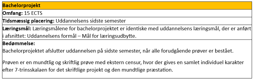 Ved bedømmelse af bachelorprojektet indgår den studerendes stave- og formuleringsevne i bedømmelsesgrundlaget, jf. eksamensbekendtgørelsen §13, stk. 2.